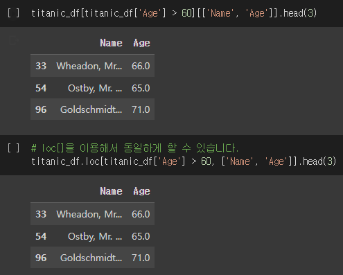 실제로 동일한 불린 인덱싱을 [] 연산과 loc[] 연산에서 수행할 수 있습니다. 여기서 loc[] 연산에서 ['Name', 'Age']는 칼럼 위치에 놓여야함을 주의합시다.