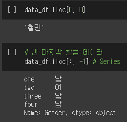 iloc[] 연산자의 결괏값은 단일 값, Series, DataFrame입니다. 하나의 칼럼만 추출했다면 Series, 다수의 칼럼을 추출했다면 DataFrame입니다. 또한, iloc[] 연산자는 불린 인덱싱을 제공하지 않습니다.