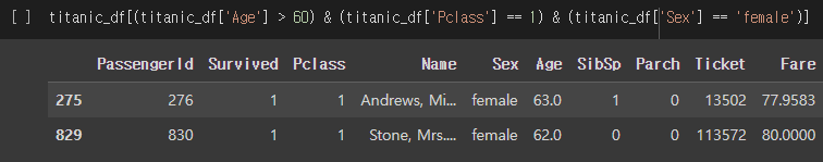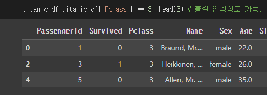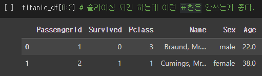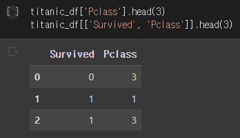 또한, titanic_df[0] 또는 titanic_df[0, 0] 같은 표현은 오류를 발생시킵니다. 칼럼명이 아니기 때문이라고 이해하면 됩니다.