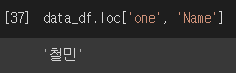 DataFrame의 loc[] 연산자는 명칭(Label) 기반으로 데이터를 추출합니다. 행 위치에는 인덱스 값을, 열 위치에는 칼럼명을 입력하여 데이터를 추출합니다.
