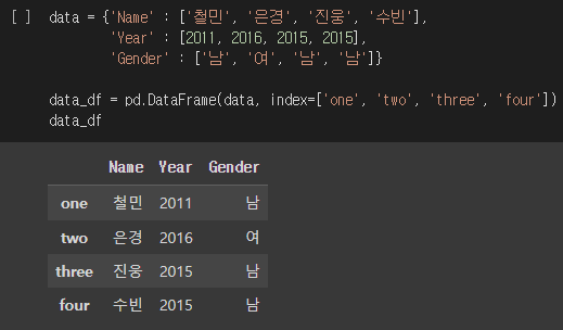 DataFrame의 []연산자 안에 들어갈 수 있는 것은 칼럼명 문자(또는 리스트 객체), 또는 인덱스로 변환 가능한 표현식입니다. 인덱스로 변환 가능한 표현식이라는 의미는 추후에 다룰텐데, 현재 수준에서는 DataFrame의 [] 연산자는 칼럼만 지정할 수 있는 '칼럼 지정 연산자'로 이해하는 게 혼돈을 막는 가장 좋은 방법입니다.