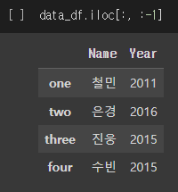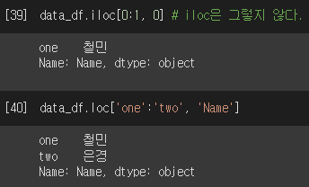 iloc[] 연산자 안에 칼럼의 이름이나 인덱스 값('one' 등)을 지정하면 오류가 발생합니다.