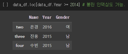 loc[] 연산자는 불린 인덱싱도 지원합니다. 즉, 불린 인덱싱은 iloc[] 연산자에서만 사용 불가능합니다.