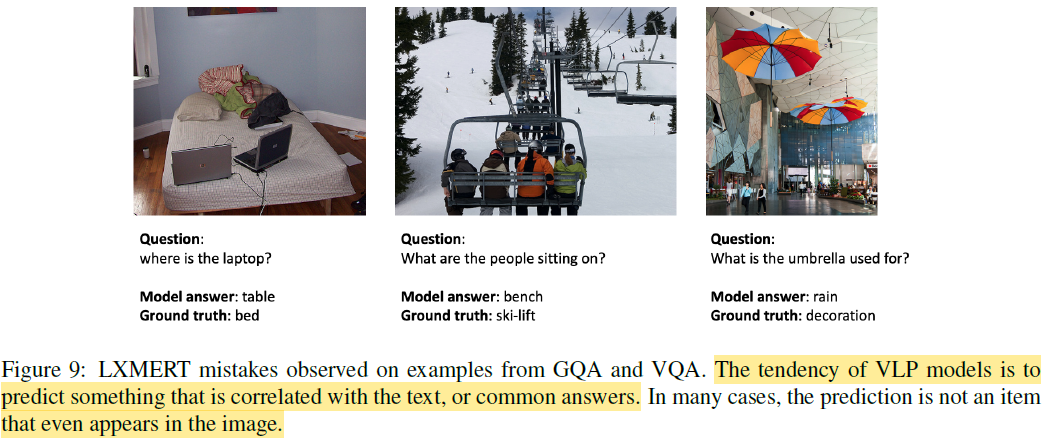 - Bias : Yang et al. (2021), Hendricks et al. (2018)은 어텐션 기반의 VLP 모델이 어텐션 모듈이 학습 데이터의 spurious correlations에 집중하도록 유도하는 bias 때문에 좋지 않은 일반화 능력을 가지게 됨을 보였다. 아래의 Figure 9가 그러한 예시를 보여준다. 사전학습 동안 모델이 이미지에 더 집중하도록 하는 것이 이러한 language priors bias를 완화하는 데 도움이 될 수 있다.
