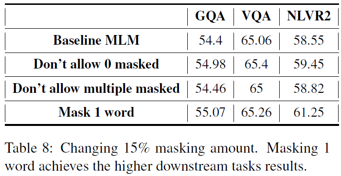 이런 세 가지 마스킹 전략으로 각각 XLMERT VLP를 진행하고 GQA, VQA, NLVR2 태스크에 파인튜닝 한 결과 성능을 비교한 테이블이다. 결과적으로 각 문장에 대해 오직 하나의 word만 마스킹하는 것이 가장 좋은 결과를 보였다. 또한 multiple masked를 금지하는 것 보다는 0 masked를 금지하는 것이 조금 더 나은 결과를 보였다.