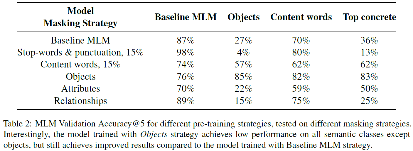 실험 결과를 보자. Objects 마스킹 전략을 적용한 모델은 stop-words, punctuation, relationships 에 속하는 토큰들을 잘 복원하지 못했다. 중요한 점은, 그럼에도 불구하고 다운스트림 태스크 파인튜닝에 대한 성능 (사실 이 지표가 가장 중요하다)은 Baseline MLM (15% 랜덤 마스킹) 보다 좋았다는 것이다.