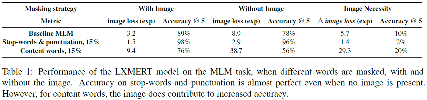 캡션 중 45~50%의 토큰은 stop-words 혹은 punctuation이다. 그래서 랜덤 마스킹을 하면 이런 토큰들이 마스킹 될 확률이 높다. 이는 모델이 MLM을 푸는 과정에서 이미지를 사용하지 않는 결과를 초래한다. 왜냐하면 이러한 종류의 토큰은 굳이 이미지를 보지 않아도, 문장 간의 관계에서 쉽게 복원되기 때문이다.