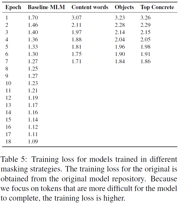 두 번째로, objects word가 가장 중요한 semantic class라는 것이다. 이는 저자들이 제안한 마스킹 전략들에 대한 다운스트림 태스크 성능 지표의 결과와 일맥상통하는 중요한 부분이다. 왜냐하면 다운스트림 태스크 성능에서도 stop-word & puncuation만 마스킹하는 전략이 가장 낮았으며 (Figure 7에서 loss gap이 가장 낮음), objects와 top concrete를 마스킹하는 전략이 가장 높았기 때문 (Figure 7에서 loss gap이 가장 큼)이다.