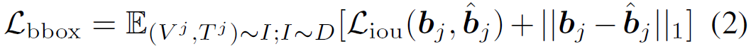 $\hat{b}^{j}(I, T^{j}) = sigmoid(MLP(x^{j}_{cls})) = (\hat{cx}^{j}, \hat{cy}^{j}, \hat{w}^{j}, \hat{h}^{j})$