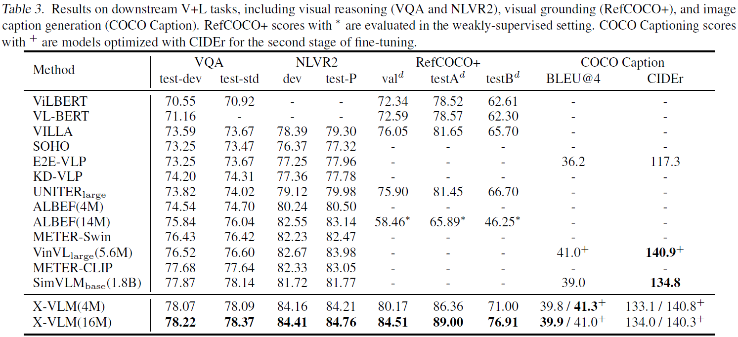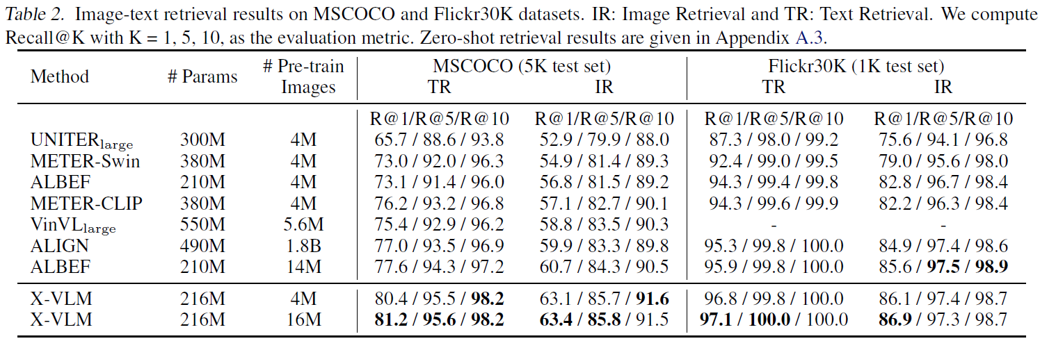 5개의 다운스트림 태스크에 대해 X-VLM의 성능을 평가했다. 앞서 언급했듯이, 다운스트림 태스크에서의 information leakage를 방지하기 위해 COCO, Visual Genome의 일부 데이터는 사전학습에 이용하지 않았음을 다시 한 번 언급한다. 이러한 데이터가 얼마나 되는지는 모르겠지만, 일단 기존 모델들보다 학습 데이터를 조금이나마 적게 썼다는 것을 명시하고 싶은 것 같다.