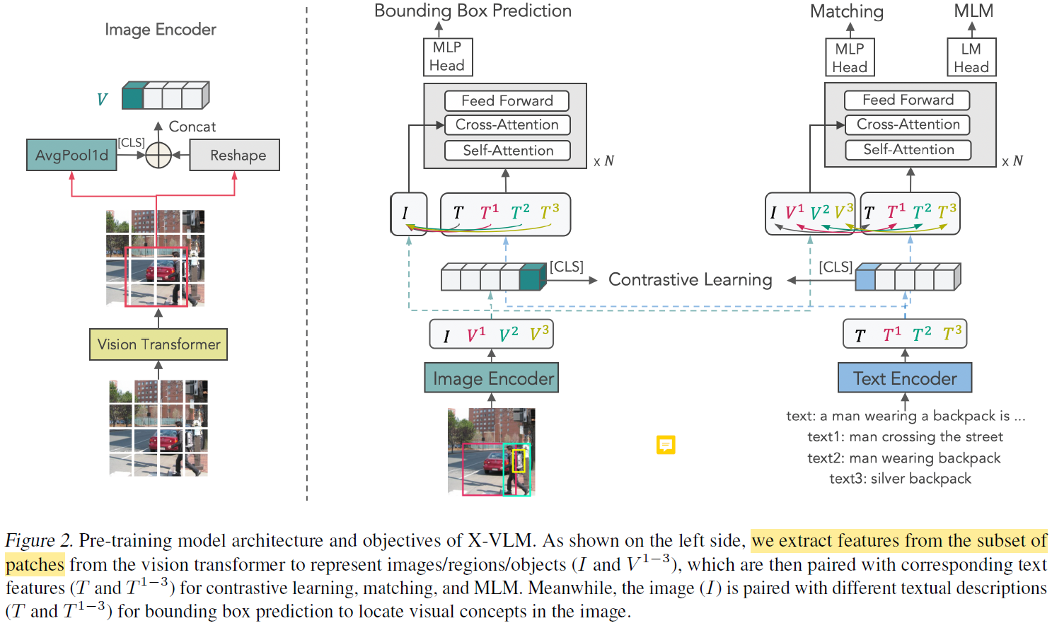 (a) fine-grained, (b) coarse-grained, (c) multi-grained 방식의 VLP 모델이다. 이 예제에 이용된 원본 (이미지, 텍스트) 데이터를 관찰해보자. 사실 이미지에는 여러 상황이 존재할 수 있다. 예를들어, "가방을 매고 있는 남자"라는 관계, "길을 건너고 있는 남자"라는 관계 등이 한 이미지에 담겨있다. 그러나 X-VLM이 나오기 전까지, 이렇게 이미지에 annotated 된 여러 visual concept을 학습에 활용한 모델이 부재했다. X-VLM은 visual concept을 image/region/object의 세 가지 카테고리로 분류한다.