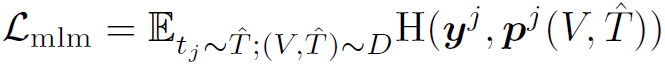 텍스트에서 25% 비율에 해당하는 토큰을 고른다. 그 후 각 토큰에 대해 10% 확률로 랜덤한 다른 토큰으로 바꾸고, 또 다른 10%의 확률로 그냥 놔두고, 80% 확률로 [mask] 토큰으로 바꾼다. 각 토큰에 대한 cross-modal encoder의 출력 임베딩에 선형 변환을 취하고 softmax 값을 뽑아낸다.