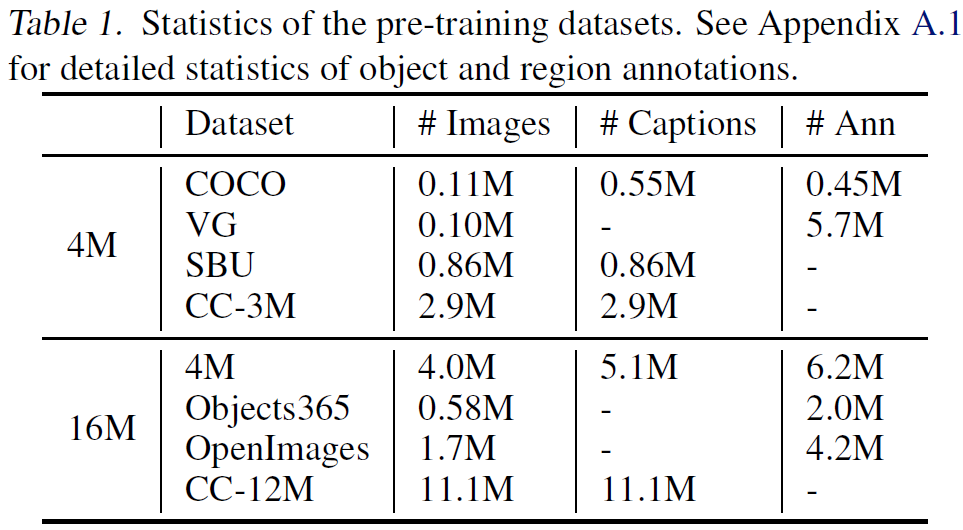 많은 VLP 모델은 4M 데이터셋을 기준으로 학습된다. X-VLM도 기존 연구들의 방식을 따른다. 앞서 언급했듯이, object annotation은 COCO와 Visual Genome, region annotation은 visual genome 데이터셋에서만 얻을 수 있다.