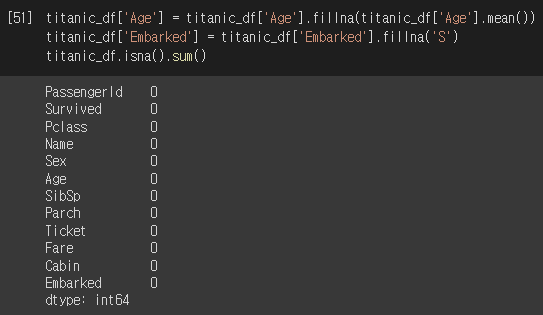 나이(age)와 같은 숫자형 데이터를 평균값으로 대체했습니다. 모든 결손값이 대체된 것을 확인할 수 있습니다.