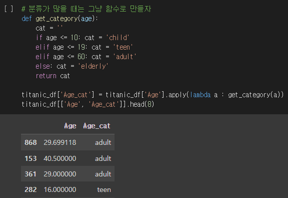 if else 구문을 이용한 조금 더 복잡한 가공의 예입니다. 나이가 15세를 초과하면 Adult로, 아니라면 Child로 매핑하여 새로운 칼럼을 만들었습니다. lambda 식에서 if else 구문이 어떻게 작성되었는 지에 주목합시다. if문이 먼저 오는 것이 아니라, 'Adult'라는 반환값이 먼저온 뒤에 조건이 옵니다. 이를 잘 기억합시다. 또한, elif는 지원하지 않습니다.
