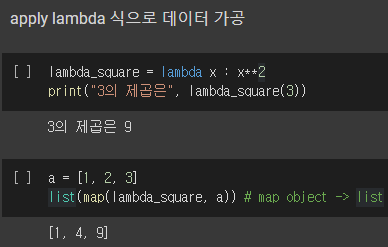 lambda 식은 파이썬에서 함수형 프로그래밍을 지원하기 위해 만들어졌습니다. 콜론의 왼쪽이 입력 인자이며, 오른쪽이 입력 인자를 통한 계산식(반환값)입니다. 여러 입력값에 대해 lambda 식을 적용하기 위해선 보통 map() 함수를 이용합니다.