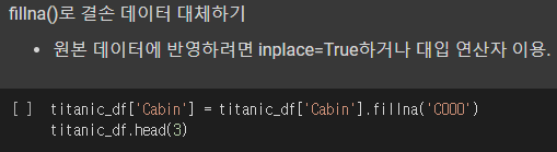 fillna() 메서드를 이용해 결손값을 대체해봅시다. 중요한 점은 fillna()를 통해 반환값을 다시 받거나(대입 연산자), fillna()의 inplace 메서드를 True로 설정해야 실제 데이터의 결손값이 대체된다는 점입니다.