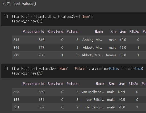 DataFrame, Series를 정렬하기 위해 sort_values() 메서드를 이용합니다. 핵심 파라미터로는 by, ascending, inplace가 있으며, by를 통해 정렬의 기준이 되는 칼럼을 지정합니다.ascending은 디폴트로 True(오름차순)입니다.