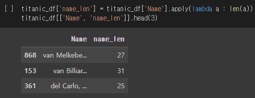 apply lambda를 통한 데이터 가공의 예시입니다. 각 Name에 대한 길이를 구해 새로운 칼럼을 만들었습니다.